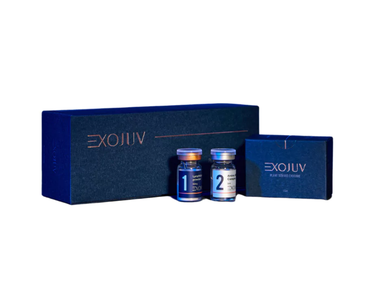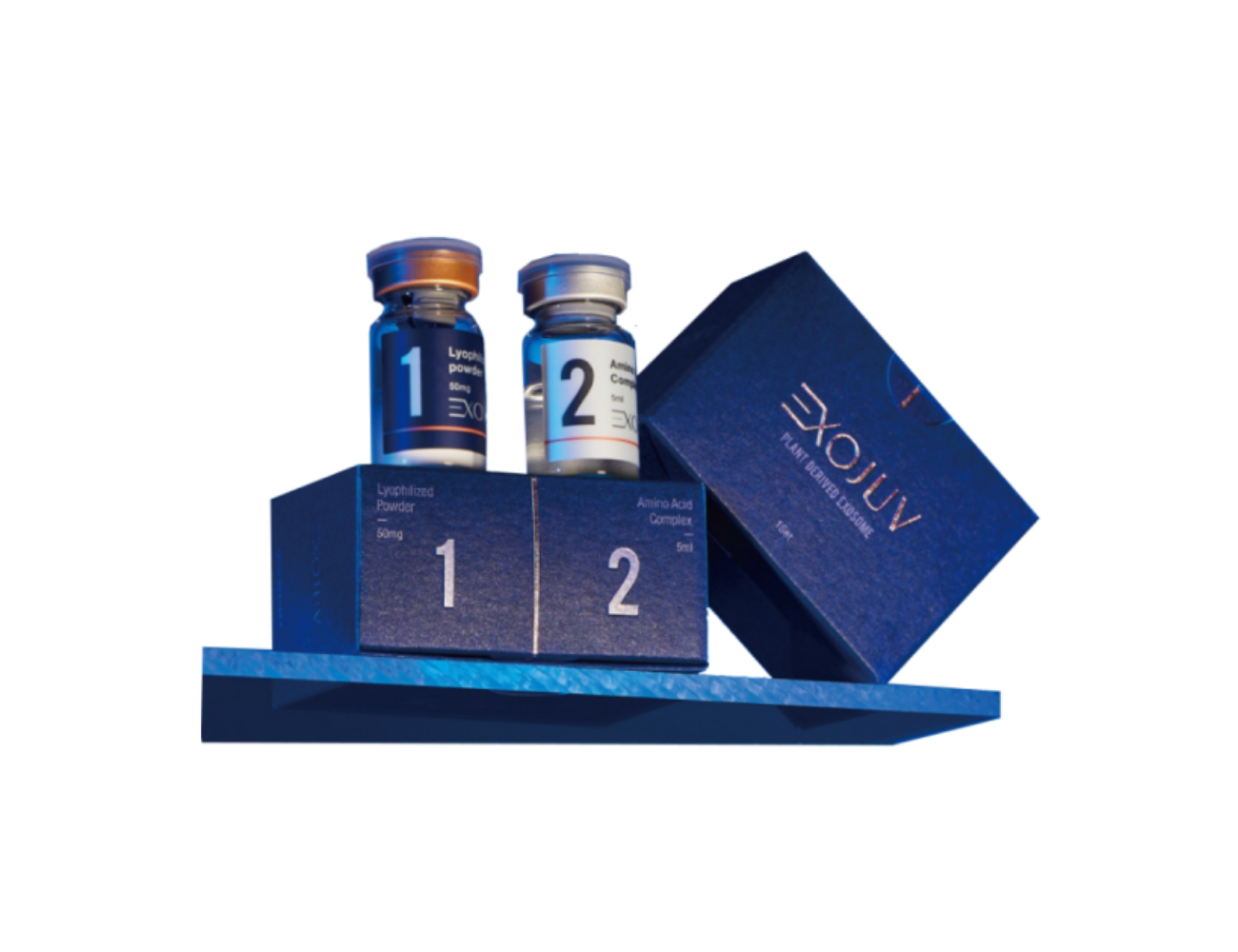 ExoJuv is packaged in 1 set of two vials of Lyophilized Exosome Powder (50 mg x 1 vial) and Activator Serum Solution (5 mL x 1 vial). It also comes in 5 sets in one box, a total of 10 vials.